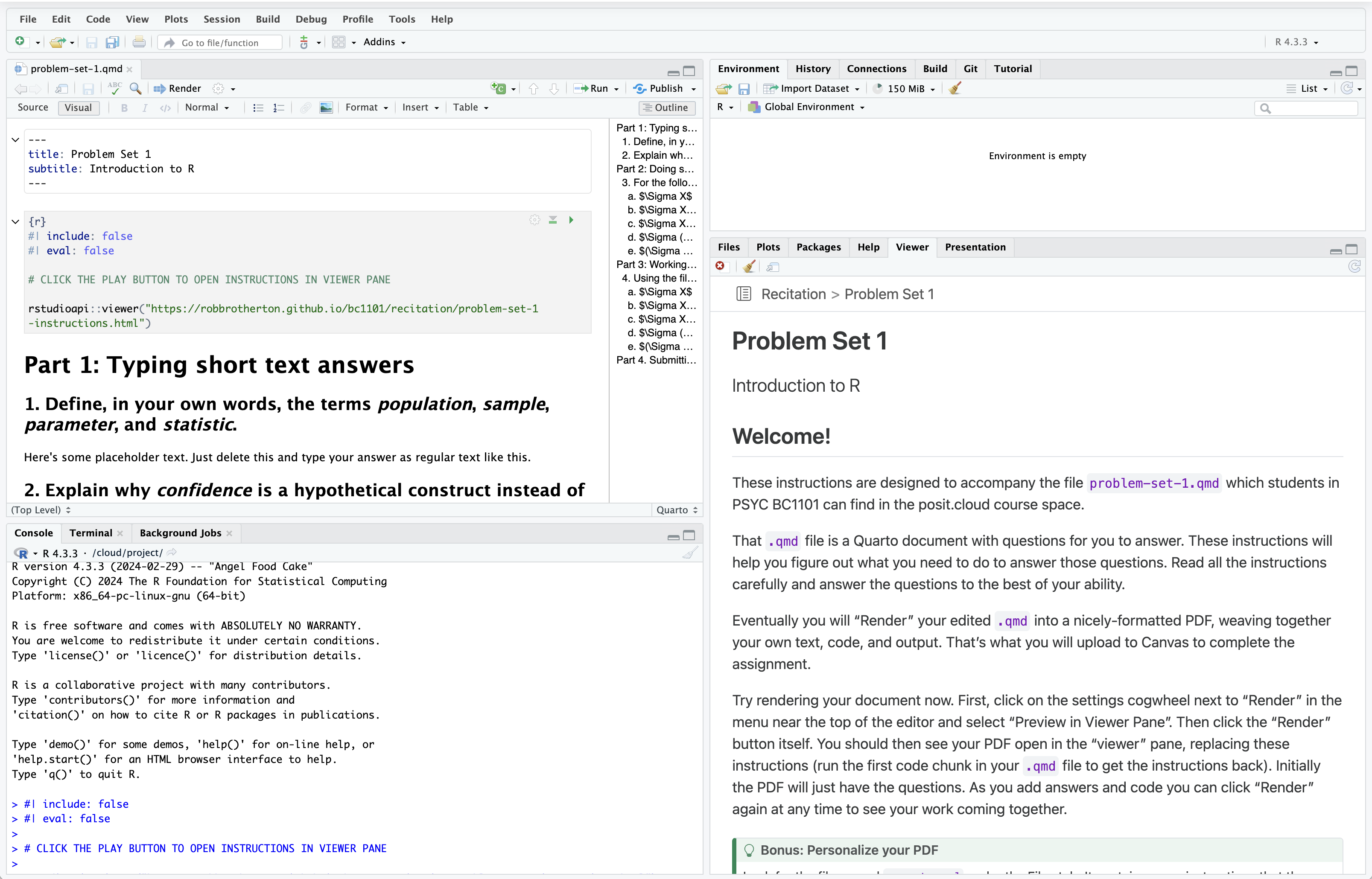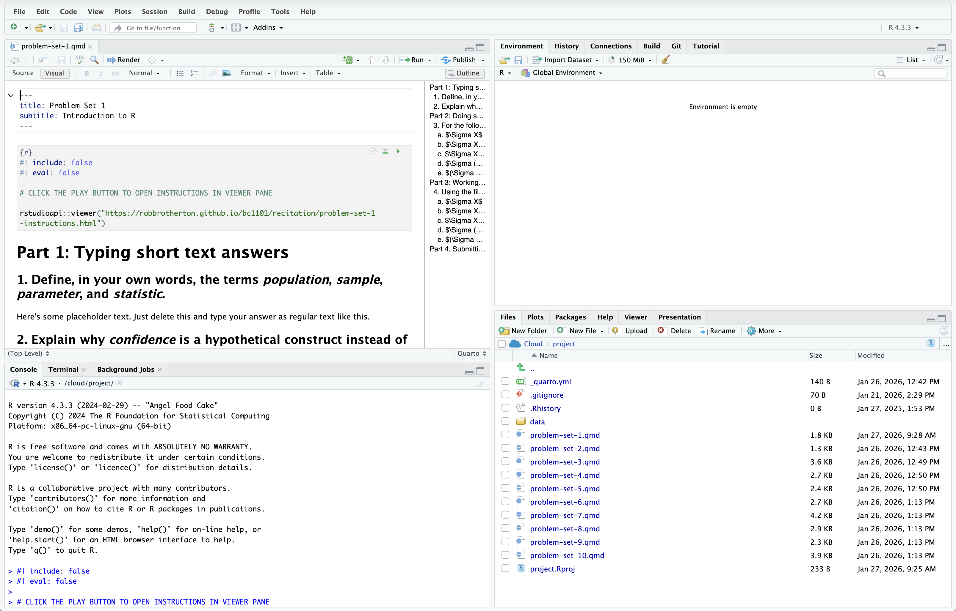 You will use posit.cloud to access problem sets as Quarto documents, using RStudio to write R code and answer questions. You’ll just need to sign up for a free account.